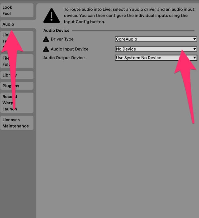 The first step to recording is getting your audio interface set up with Ableton Live. I won’t go into full details here because that’s another topic altogether. But follow the quick steps below to select your audio interface.