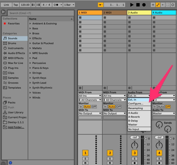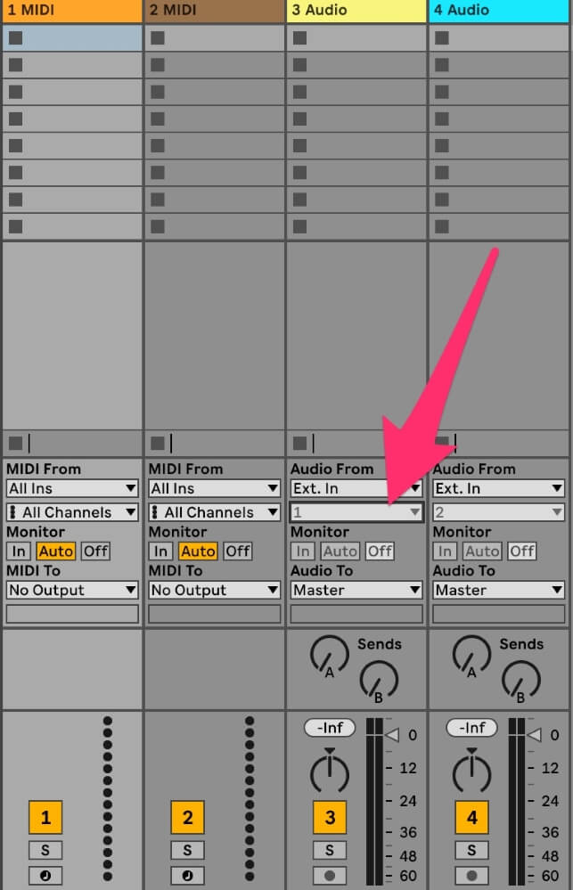 Now that your audio interface is synced up with Ableton, you need to select the input from that device you want to record from.